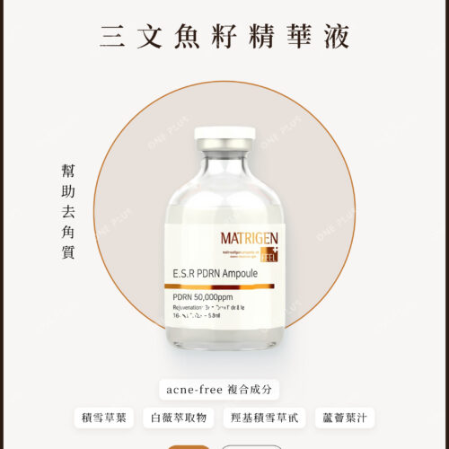 高濃度萃取三文魚DNA精華被發現與人體的基因序列DNA達98%一致,可促進細胞增殖和修復受損組織。它常被用於皮膚再生和修復的治療中,有助於改善皮膚彈性、減少皺紋和疤痕。