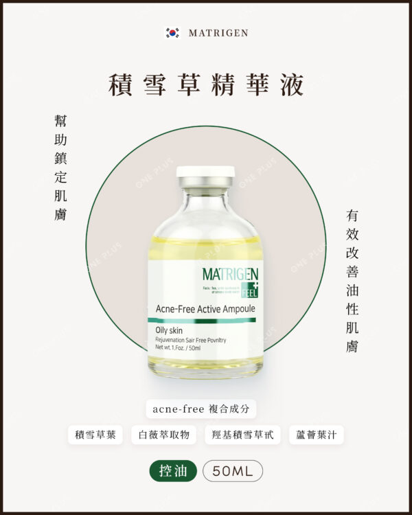 – acne-free 複合成分: 車前草萃取(消炎), 柿子萃取物(保護護理), 白柳樹皮萃取物(鎮定皮膚)家榆樹皮萃取物(清除活性氧), 掌狀海帶粉(調節皮脂分泌)